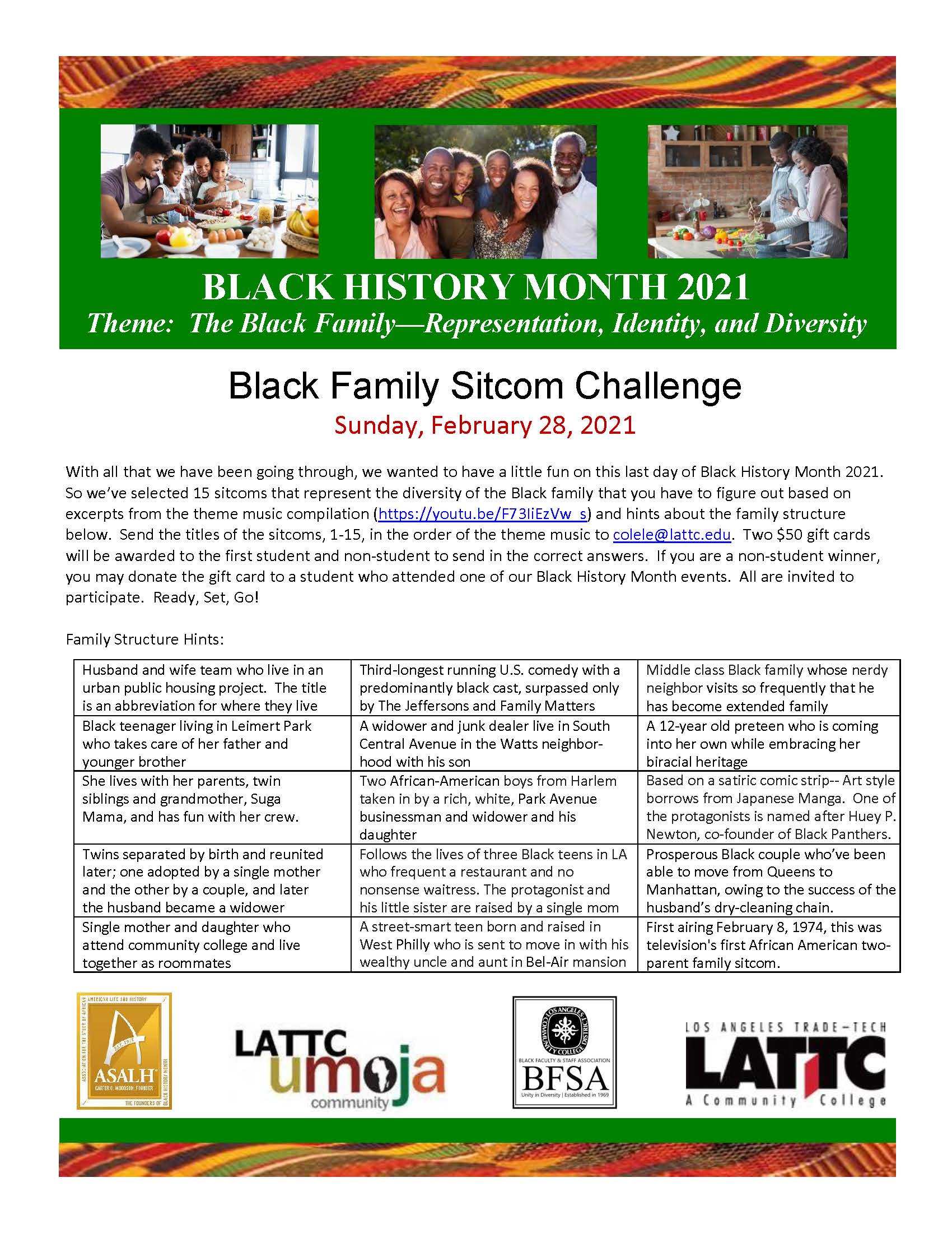 With all that we have been going through, we wanted to have a little fun on this last day of Black History Month 2021. So we’ve selected 15 sitcoms that represent the diversity of the Black family that you have to figure out based on excerpts from the theme music compilation (https://youtu.be/F73IiEzVw_s) and hints about the family structure below. Send the titles of the sitcoms, 1-15, in the order of the theme music to colele@lattc.edu. Two $50 gift cards will be awarded to the first student and non-student to send in the correct answers. If you are a non-student winner, you may donate the gift card to a student who attended one of our Black History Month events. All are invited to participate. Ready, Set, Go!